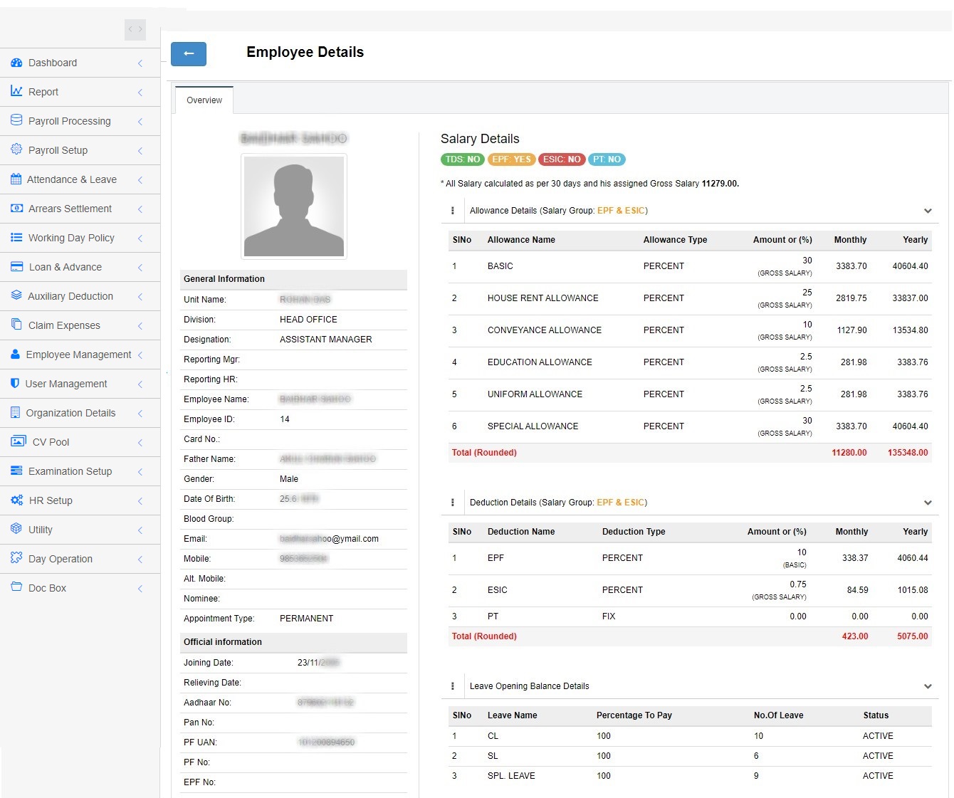 Automatic update on number of days worked according to Attendance, Leaves Granted, Loss of Pay and generate pay slips.